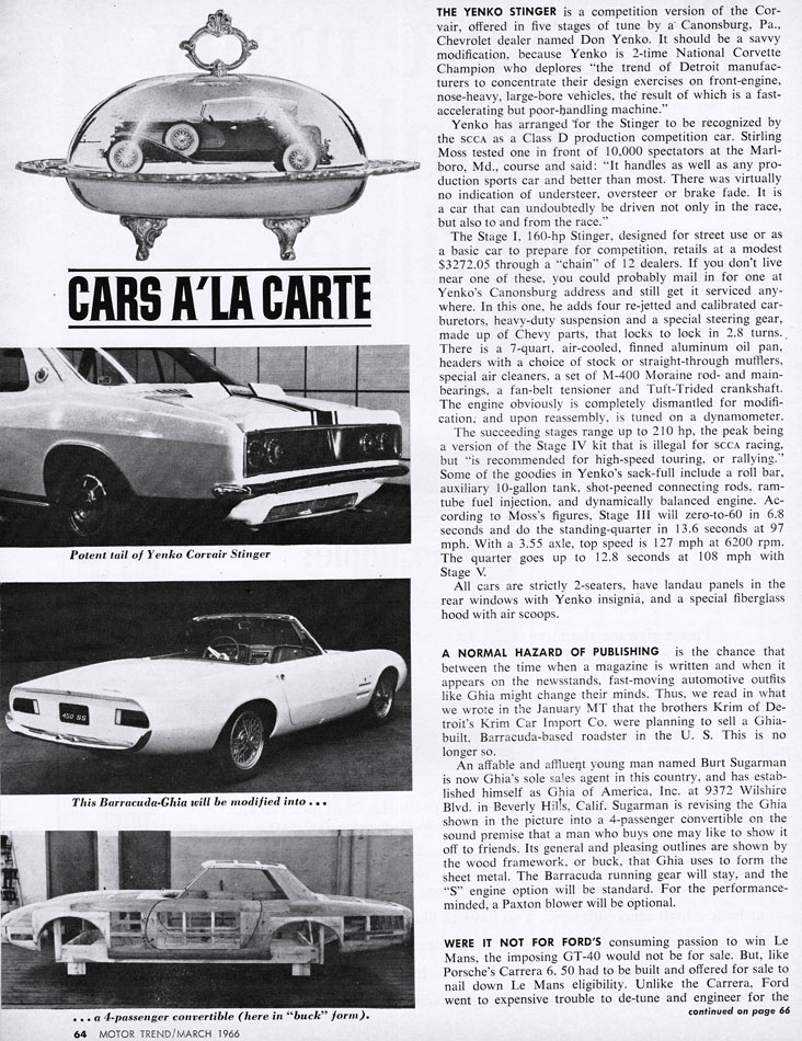 Article from Car and Driver magazine, March 1966, Racing and For You Information pages 69 – 72. Copyright 1966 by Ziff-Davis Publishing Co, 307 North Michigan Ave, Chicago, IL 60601