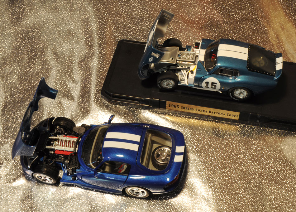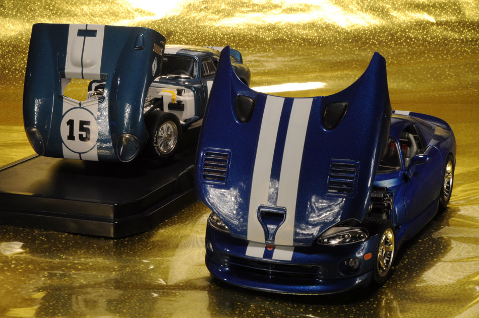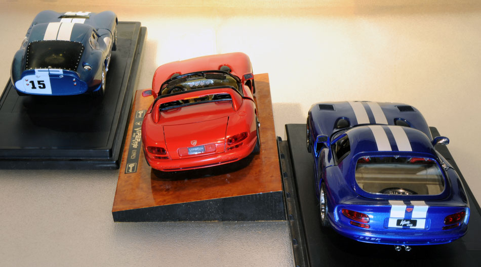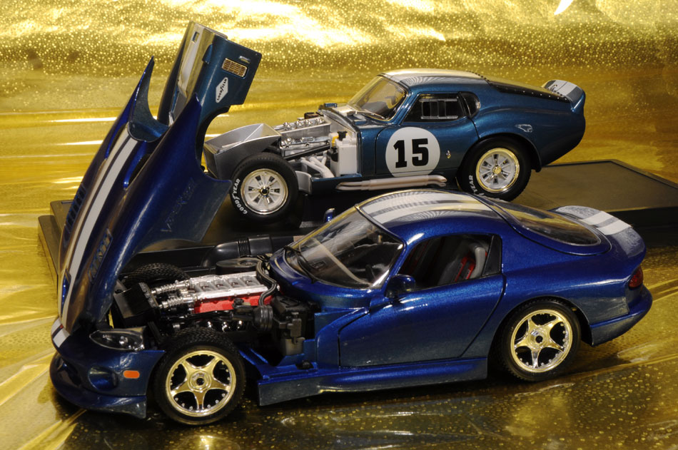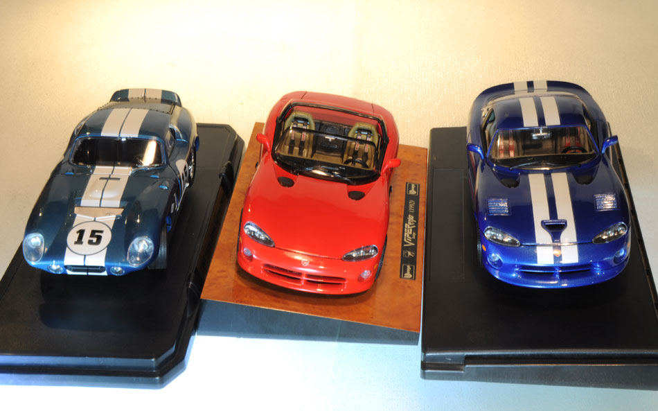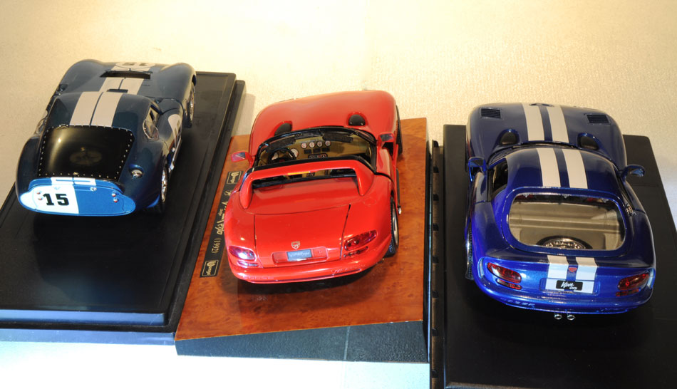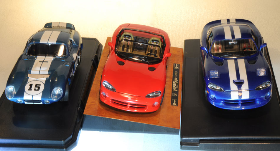 Images of The 1965 & 1969 Shelby Cobra Hand-crafted Ertl Die-cast Metal Replica in 1:18 Scale, 1992 Dodge Viper and 1996 Dodge Viper GTS Durago Italy Metal Replica in 1:18 Scale Copyrighted 2019 by HKK Productions Inc