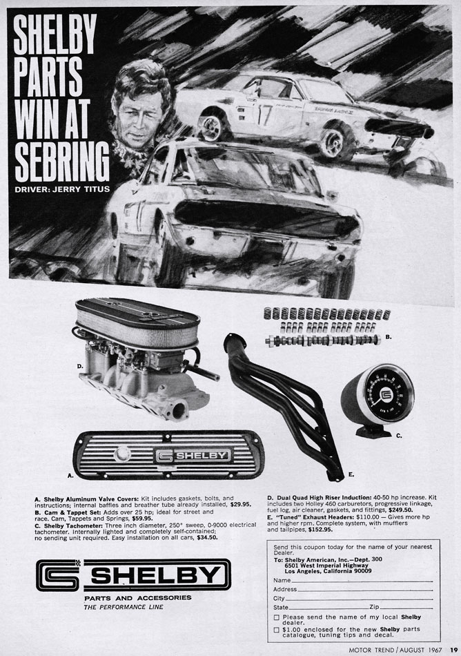 Images of The Carroll Shelby Ads Copyright 1966 – 1969 by the Ford Corporation, Autolite, Champion Spark Plugs Company, Shelby Parts and Accessories, Hai Karate Pfizer Company, Motor Trend Coming Next Month
